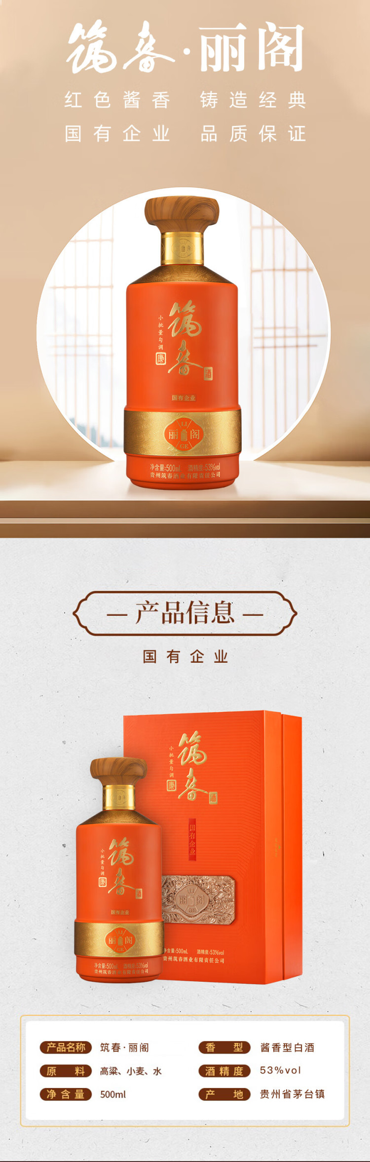 贵州筑春·丽阁酱酒 酱香白酒53% 500ML 500ml/瓶